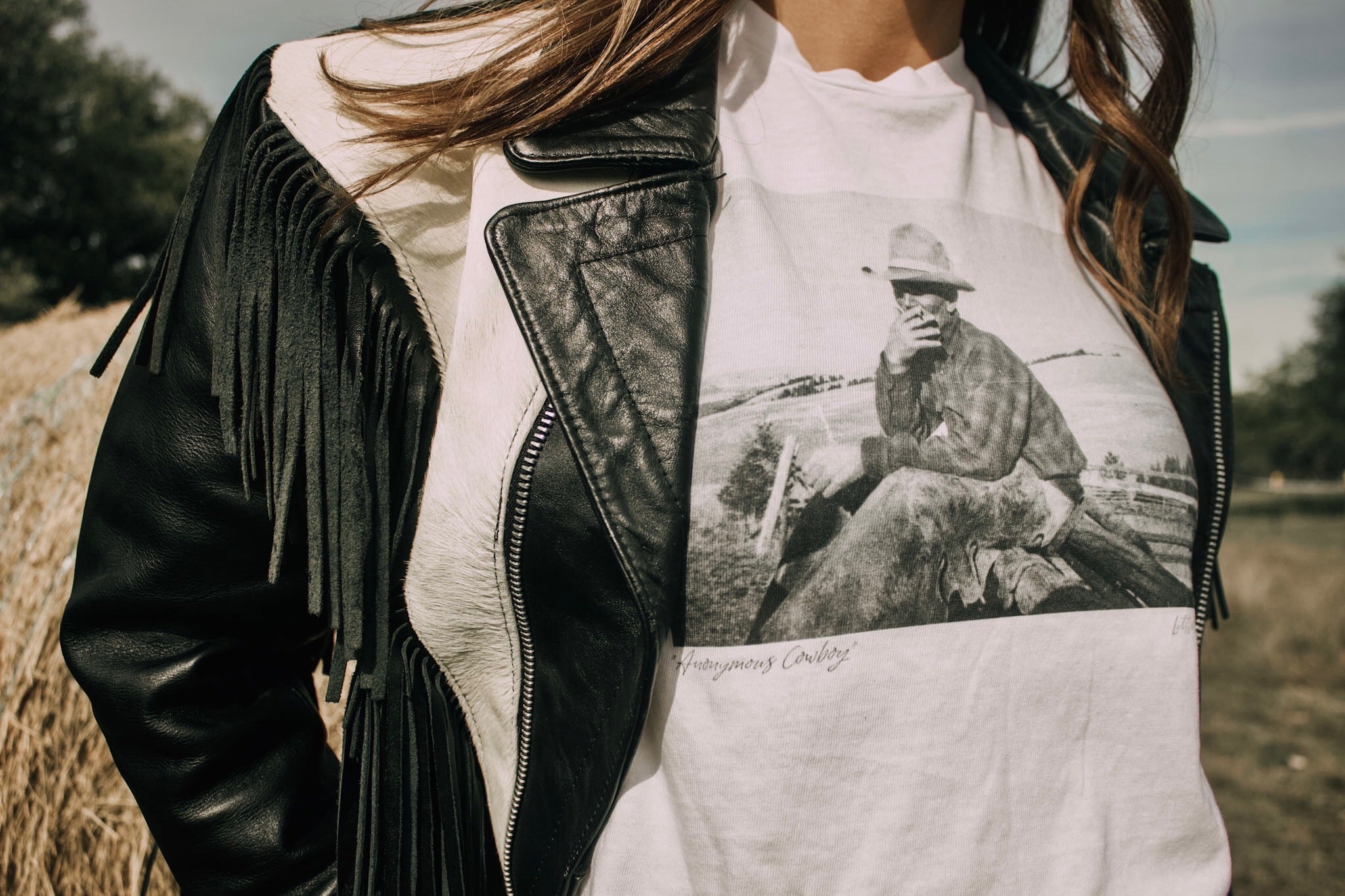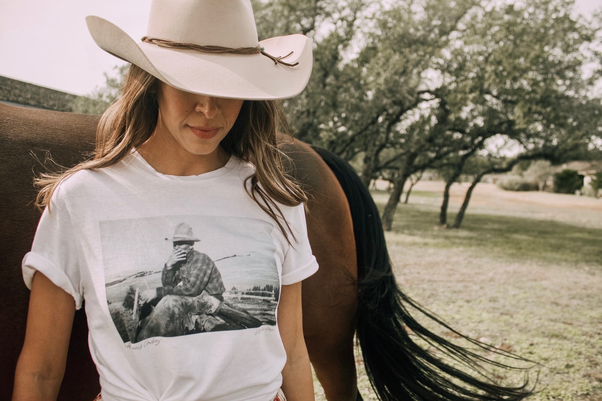 100% cotton tee featuring black and white photo of a Montana wrangler c. 1938