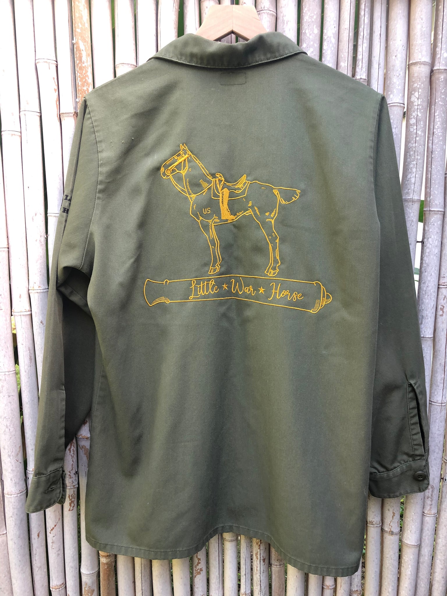 Each of our vintage military jackets are sourced from around the world, hand selected by myself, and embroidered with our special caparisoned horse in remembrance of all who have served, 2 and 4 legged alike. Every piece is unique and named after a brave and true war horse, making it a special piece to cherish for years to come.
