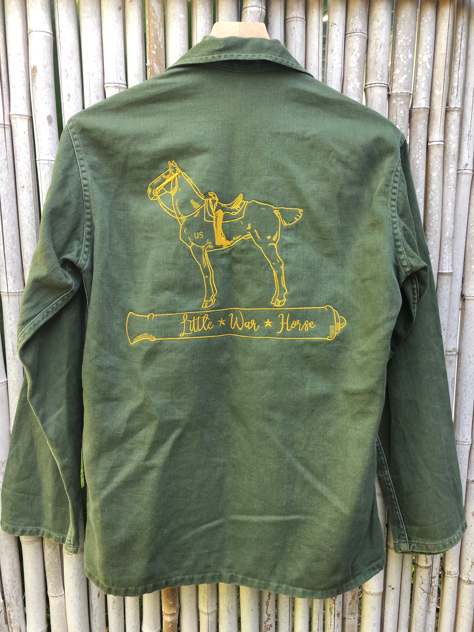 Each of our vintage military jackets are sourced from around the world, hand selected by myself, and embroidered with our special caparisoned horse in remembrance of all who have served, 2 and 4 legged alike. Every piece is unique and named after a brave and true war horse, making it a special piece to cherish for years to come.